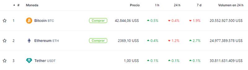 Ethereum (ETH), por su parte, marcó una caída del 0,4% en el último día. En tanto, la segunda criptomoneda más relevante del mercado pasó a cotizar u$s 2.369.