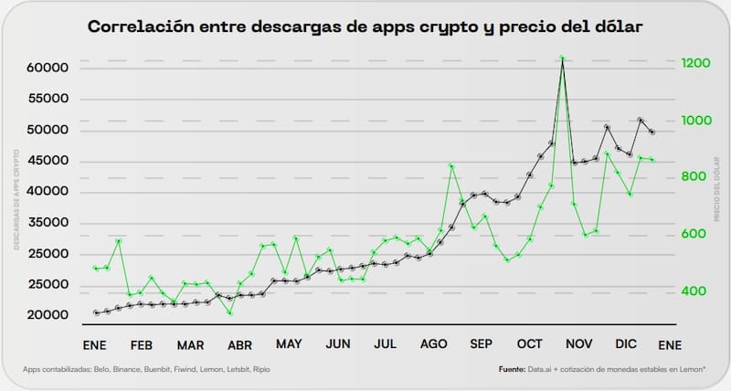 El uso de criptomonedas en el país ha destacado como protección contra la devaluación del peso argentino, como lo muestra el siguiente gráfico, que compara las descargas de aplicaciones cripto locales con el precio del dólar frente al peso argentino en 2023.