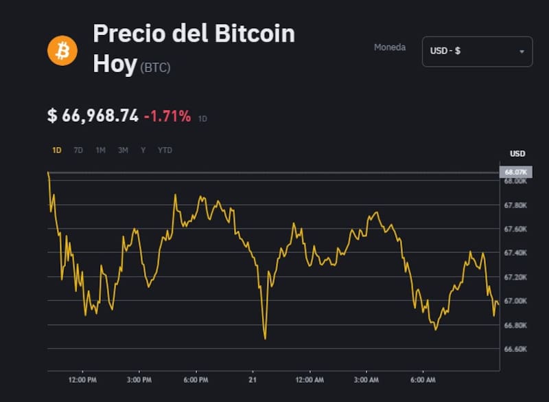 Con una caía del 1,71% en las últimas 24 horas, Bitcoin (BTC) se alejó de la zona de los u$s 70.000. Ahora, la moneda de mayor relevancia para el mercado cotiza a u$s 66.968.