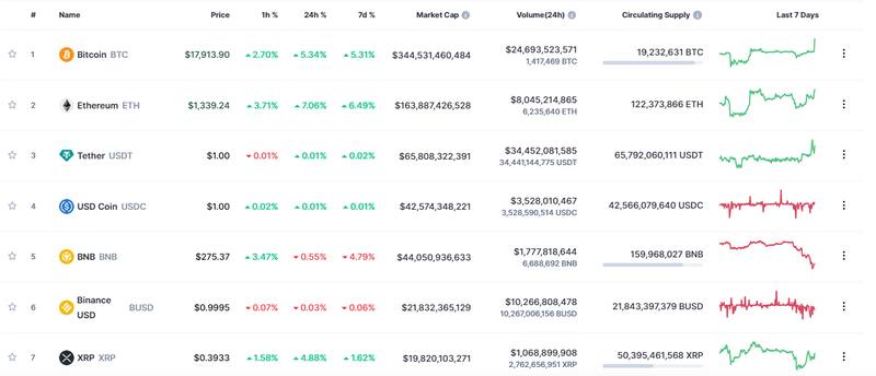 Actualmente, Bitcoin cotiza apenas por debajo de los u$s 18.000, presentando una subida diaria de más de 5%. En el mismo sentido, en la última semana, la criptomoneda subió también más de 5%. Lo mismo vale para Ethereum, que presenta una suba de más del 7% en las últimas 24 horas.