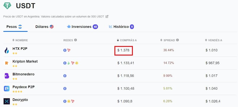 De acuerdo a los datos de Criptoya, el sitio que compara los precios de los criptoactivos en diferentes plataformas, USDT ya se ofrece a $ 1.300 en el sistema peer to peer (P2P) del exchange HTX. Se trata del valor de compra más alto que despliega la página web previamente mencionada.