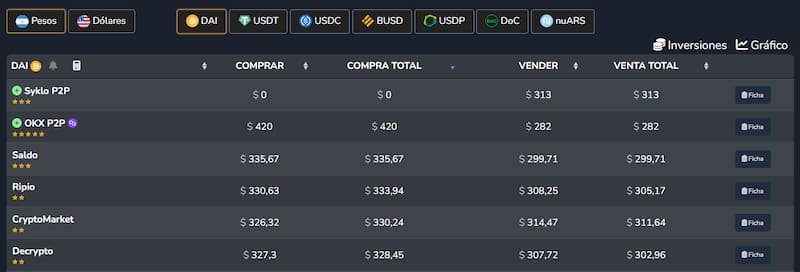 En CriptoYa.com el precio promedio de la criptomoneda está en $ 318, lo que la pone unos $ 6 por encima del precio oficial del dólar Blue. Con esto en mente, los mejores lugares para comprar criptomonedas estables son: