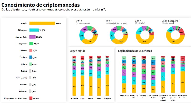 Respecto a la elección de inversión, Bitcoin sigue siendo la cripto preferida a lo largo de todo el espectro de ahorristas e inversores. Es seguida de cerca por Ethereum, del mismo modo que sucede a nivel global con la cotización de sendas criptos. La criptomoneda meme, Dogecoin, representa más de un 10% de la cartera de inversión de los argentinos.