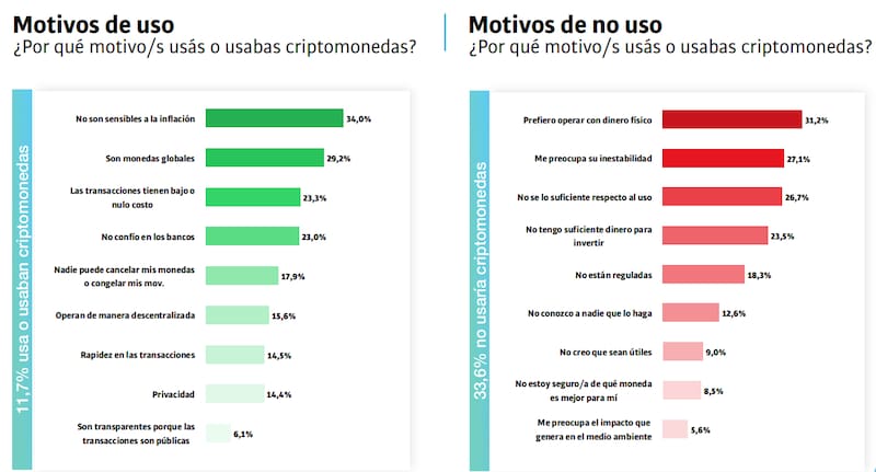 El relevamiento arrojó que 1 de cada 2 argentinos usaría criptomonedas. Mientras que el 34% de quienes usan o usaron criptomonedas lo hacen porque no son sensibles a la inflación. Esta es una de las claves de la adopción cripto en el país: muchos de sus usuarios tienen como prioridad escapar a la crisis financiera.