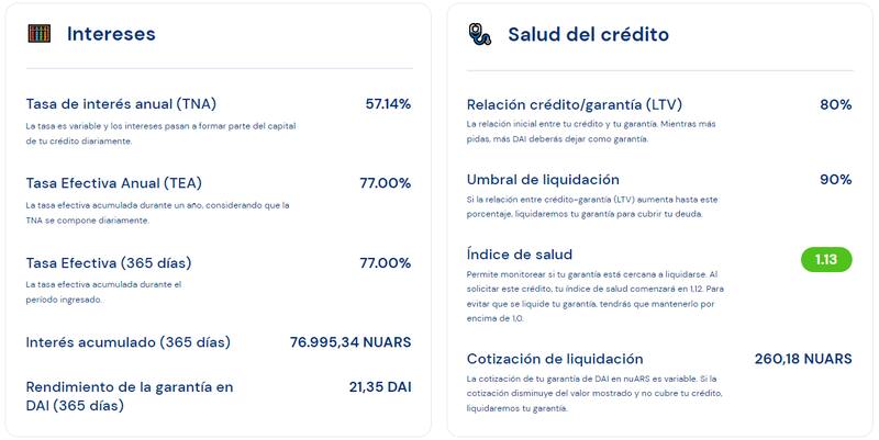 "Por ejemplo, para pedir un crédito de 3 millones de nuARS, la garantía a dejar es de 12.700 DAI aproximadamente", añade y luego comenta que desde el portal de Buenbit es posible utilizar una calculadora para estimar cuanto es el colateral en DAI que se debe congelar.