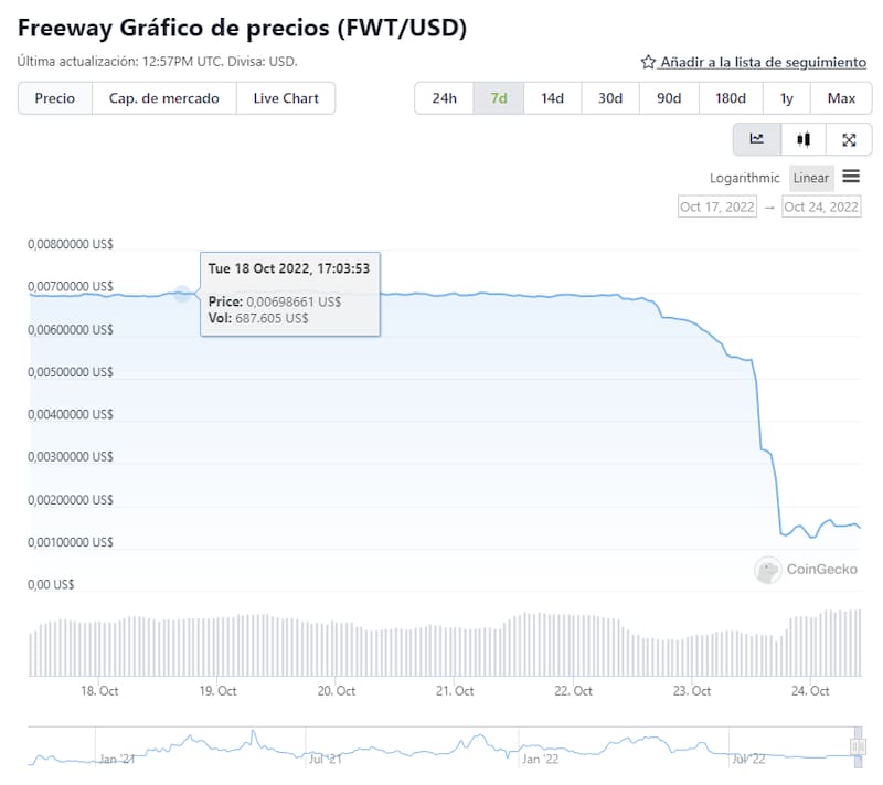 La noticia de la paralización de algunos servicios ha hecho que su token Freeway (FWT) caiga más de un 75% en las últimas 24 horas, según CoinGecko.