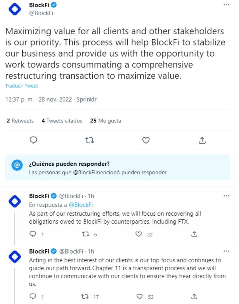 En el comunicado, la empresa promete "trabajar para reestructura el valor" que la compañía perdió tras la caída de uno de sus clientes. BlockFi afirma que buscará "recuperar todas las obligaciones con las contrapartes, incluido FTX".