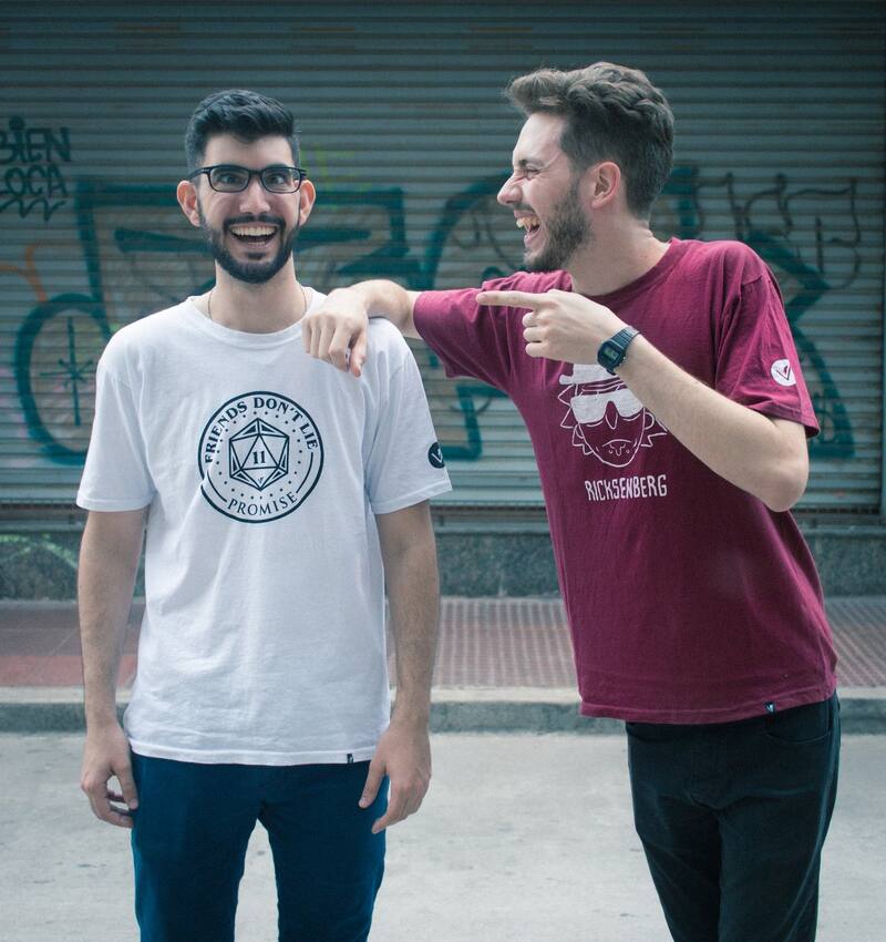 Agustin Parra (@agustinparrab) y Gino Gori (@ginogori) posando con las remeras de Very Difficult.