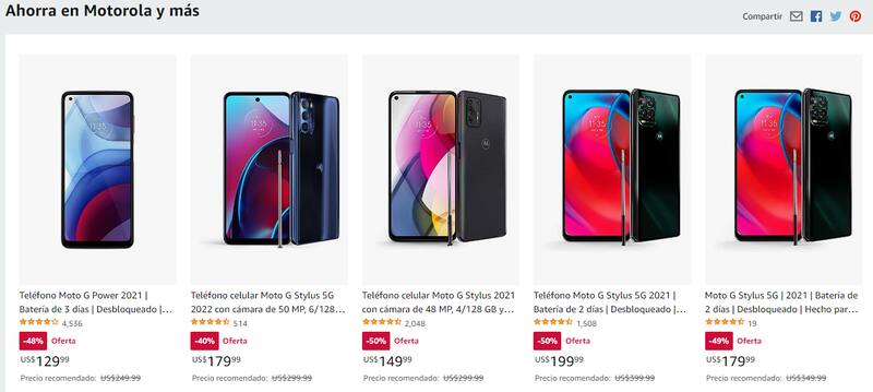 Amazon también tiene una sección con super ofertas en celulares. Por ejemplo, de la marca Motorola hay variedad de modelos y con descuentos que llegan hasta el 50%.