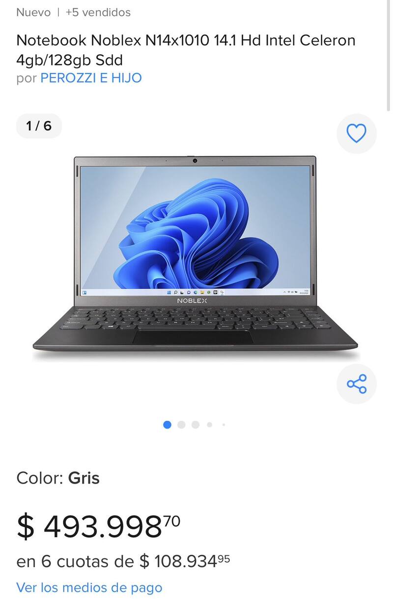 Asimismo, dentro de este listado se incluye a la notebook "Noblex" (color gris) de 4 GB de memoria RAM y capacidad de almacenamiento de hasta 128 GB. Además, su tamaño de pantalla es de 14,1 pulgadas y también dispone de un procesador Intel. Tiene un costo de $ 493.998,70 en Mercado Libre.