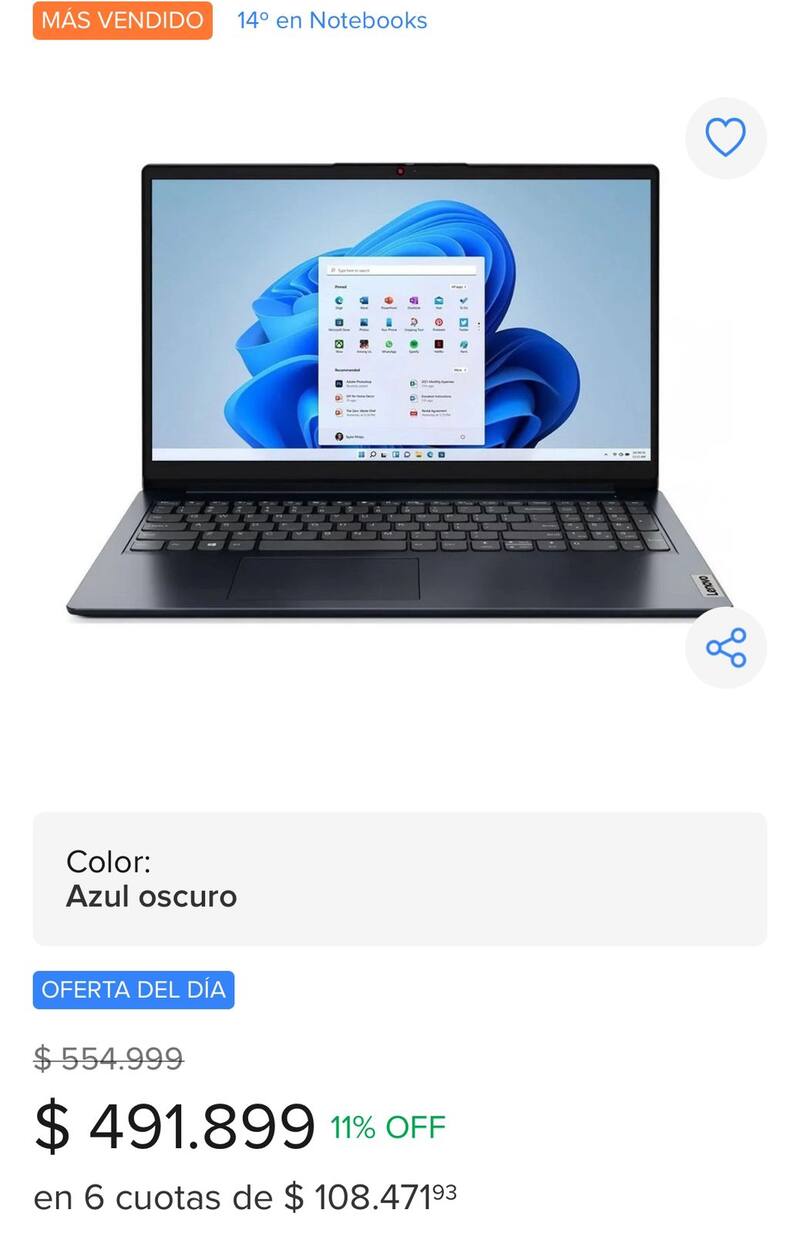 Entre los modelos de notebooks que se encuentran dentro de las "ofertas del día" en Mercado Libre, se destaca la "Lenovo Ideapad Pentium" (color azul oscuro) de 4 GB de memoria RAM. Su precio es de $ 491.899, cuenta con un procesador Intel, tamaño de pantalla de 15,6 pulgadas y capacidad de almacenamiento de hasta 128 GB.