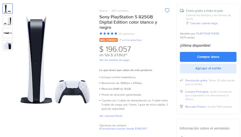 Otra posibilidad es Mercado Libre, donde ya hay vendedores que venden PlayStation 5 y tienen buena reputación, algo clave a la hora de adquirir un producto de alto valor. En la plataforma, su valor ronda los $170.000 a $197.000 y pueden adquirirse en 12 cuotas.