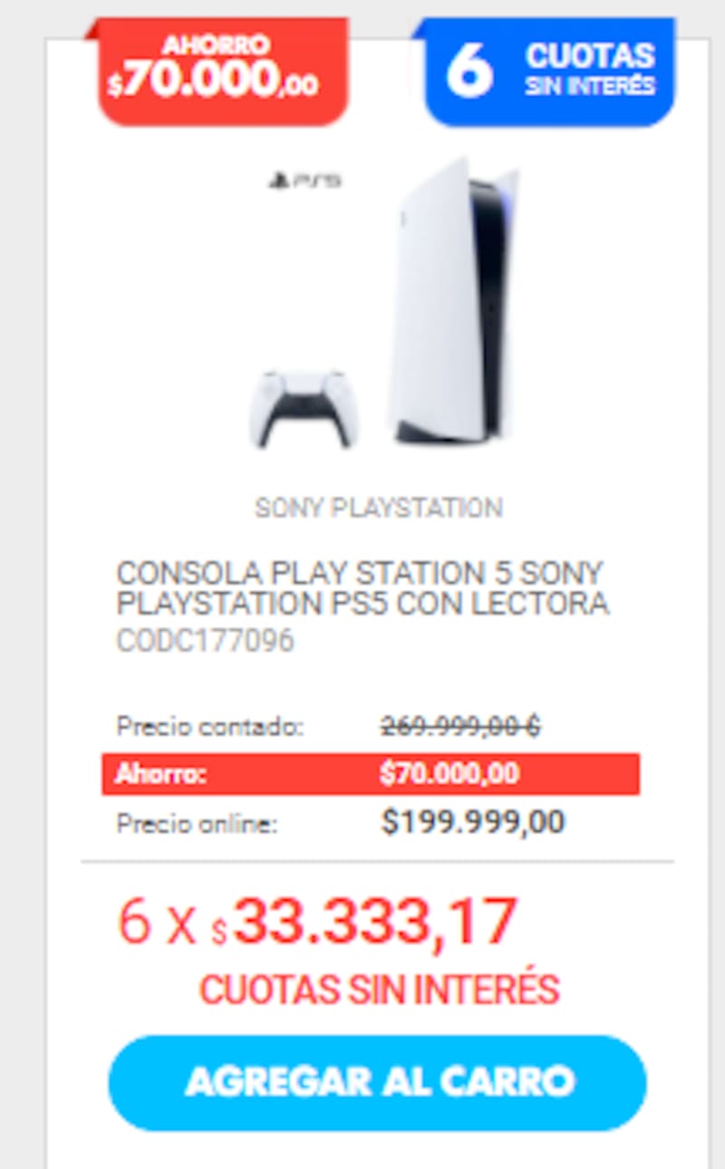 Por otro lado, se puede conseguir en Musimundoen seis cuotas sin interés de $33.333,17. En el e-commerce oficial, la marca ofrece, además, la consola rebajada en $70.000.