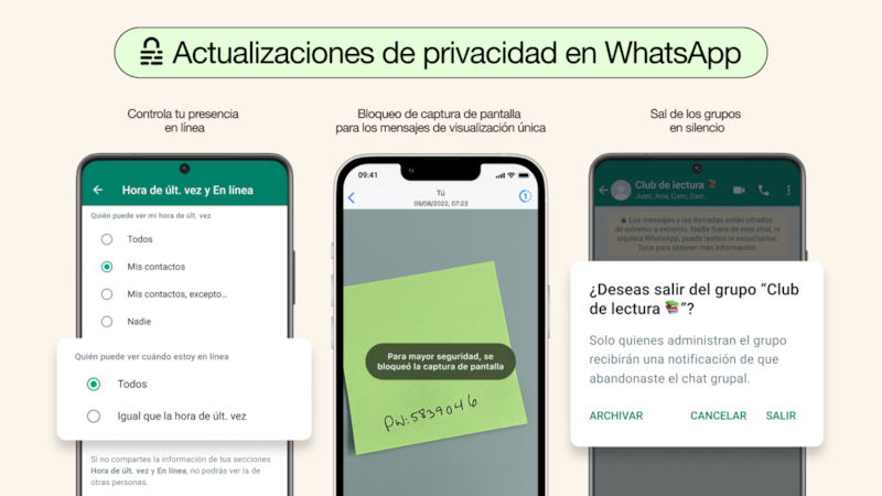 En cuanto a tiempos de llegada a la app oficial, desde la empresa explicaron que la capacidad de salir de los chats de forma silenciosa comenzará a estar disponible a partir de hoy, la posibilidad de ocultar la última conexión se habilitará durante el presente mes y el bloqueo a capturas de pantalla para fotos temporales entrará en su etapa de pruebas final -sin fecha definida de llegada a la app estable-.