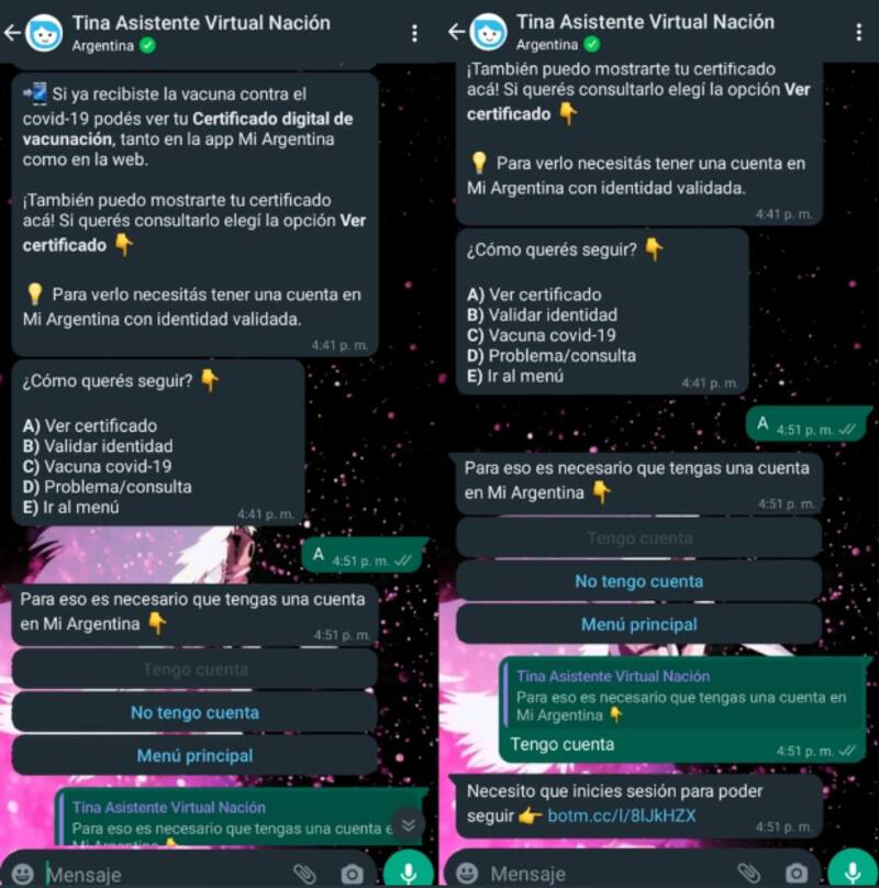 WhatsAppes la aplicación de mensajería instantánea más utilizada en el mundo y en Argentina es utilizada para realizar trámites a través de los bots como Tina a escala nacional y Boti en la Ciudad de Buenos Aires. Con el aumento de casos de Covid, resultan útiles para solicitar información como el certificado de vacunación o las postas sanitarias para aplicarse la dosis indicada.