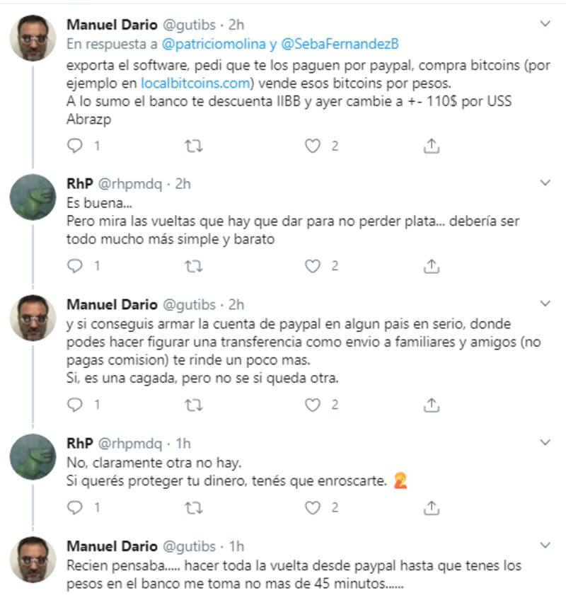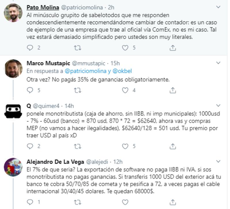 El autor aclaró que, si bien había imprecisiones en su ejemplo ficticio, la idea general se mantenía: es poco conveniente declarar los ingresos cuando se exportan este tipo de servicios que se pagan en dólares y los traen el país a través de Comex. Los participantes del hilo comentaron posibles "soluciones" a este situación que incluían desde radicarse en el Uruguay hasta cambiar las ganancias a Bitcoin u otras monedas menos traceables por el gobierno nacional.