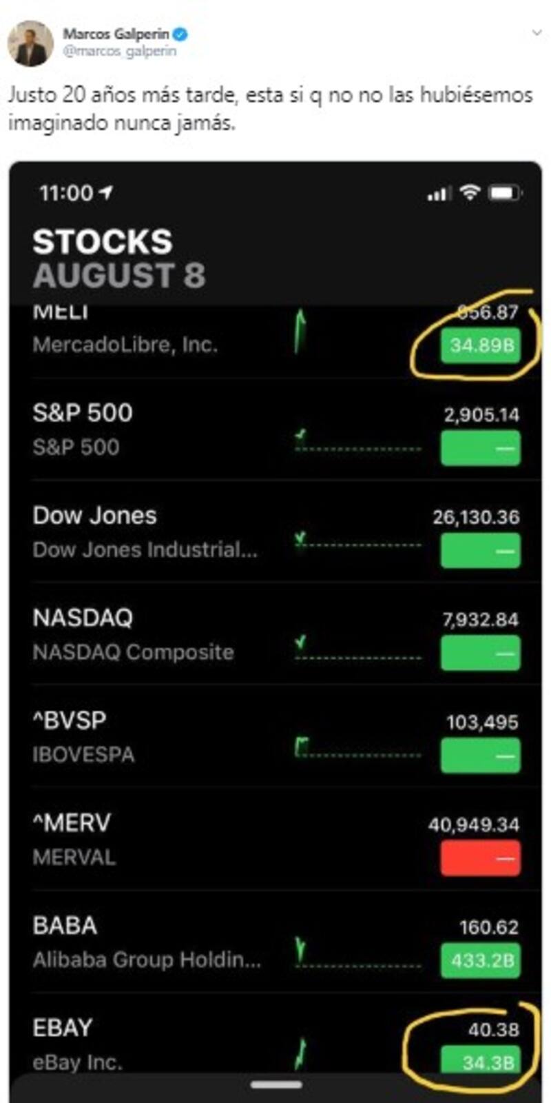 En ese sentido, el propio Galperin posteó en su cuenta personal de tuiter una toma de pantalla que muestra la cotización de MercadoLibre superando a nada menos que eBay.