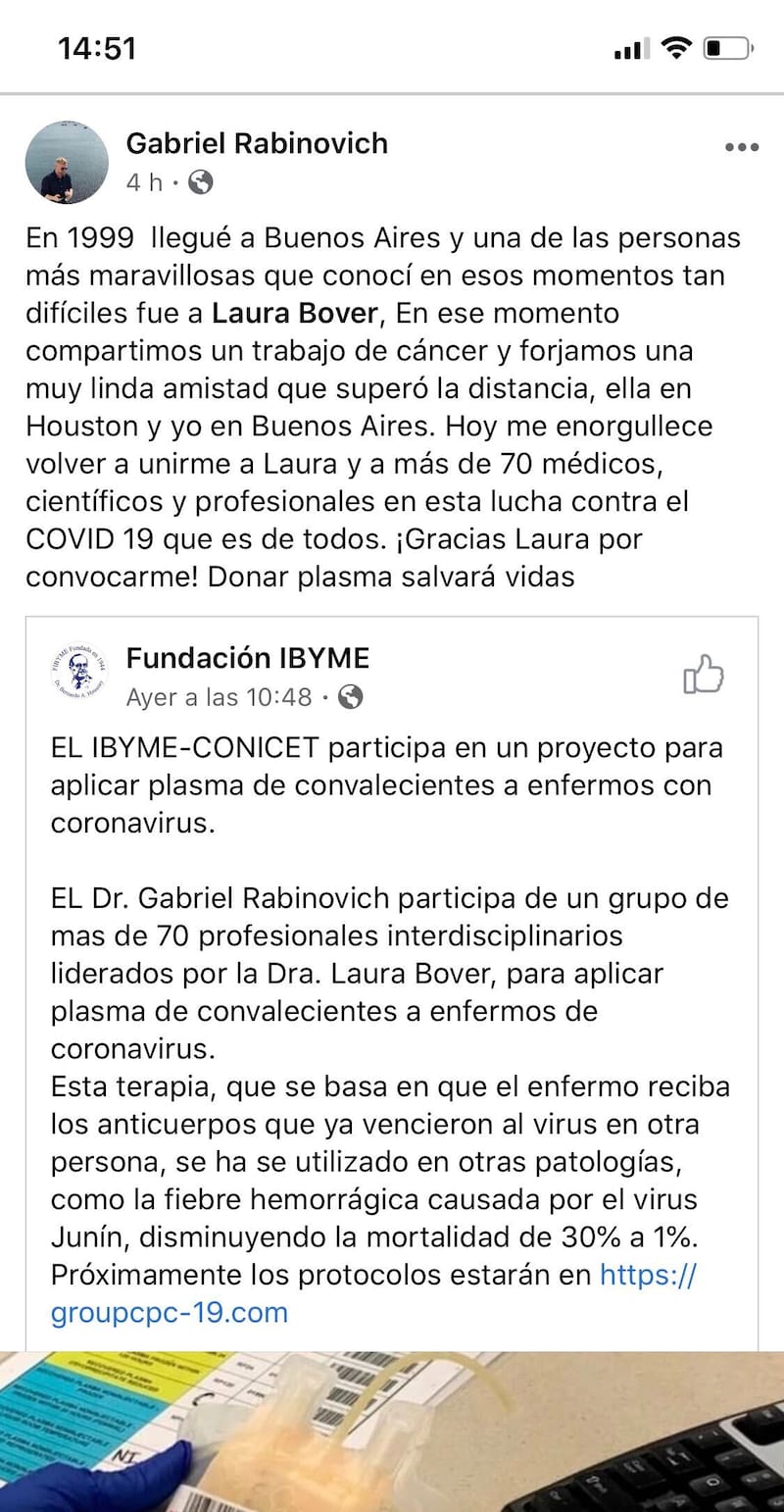 Un grupo de más de sesenta profesionales -la mayor parte argentinos, algunos de los cuales residen en Estados Unidos- autodenominado CPC-19 (Convalescent Plasma COVID-19) trabaja actualmente ad honorem, bajo la coordinación de Laura Bover -investigadora del M.D. Anderson Cancer Center de Houston (Texas, Estados Unidos)- en la elaboración de protocolos de emergencia para la utilización de plasma de pacientes recuperados de la infección por el Coronavirus SARS–CoV-2, que sea rico en anticuerpos específicos, en el tratamiento de casos severos de COVID-19, que no respondan a las terapias aprobadas por el Ministerio de Salud de la República Argentina.