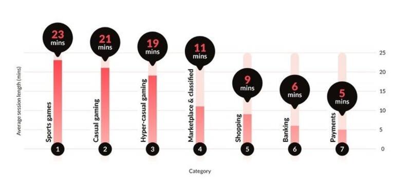 Los juegos deportivos son las aplicaciones que se les concede más horas, ya que el usuario promedio le destina alrededor de 23 minutos diarios sin pestañear, seguido de juegos casuales (21 minutos) y los "hiper-casuales" (19 minutos) súper simples y fáciles de jugar como Flappy Bird.