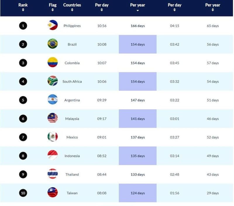 Según la consultora Sortlist, la Argentinaocupa el quinto lugar, con un promedio de 9 horas y 39 minutos al día y un total de 147 días al año. En el primer puesto está Filipinas, con 10 horas y 56 minutos; más abajo, con unos pocos minutos de diferencia, se encuentra Brasil con 10 horas y 8 minutos; le sigue Colombia con 10 hs y 7 minutos y luego Sudáfrica con 10 hs y 6 minutos.