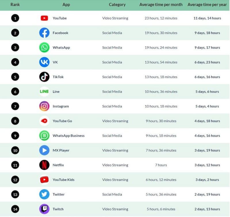Entre las aplicaciones más populares, YouTube se ubica en el primer puesto: sus usuarios pasan mayor tiempo ahí. Alcanza un total de 11 días y 14 horas al año (23 h y 11 m mensuales). Le sigue Facebook, con 9 días y 18 anuales (19 h y 30 m), WhatsApp logra 9 días y 18 o 19 h y 24 m. Curiosamente, TikTok está quinto con apenas 6 días, 16 horas y mucho más abajo, Instagram.