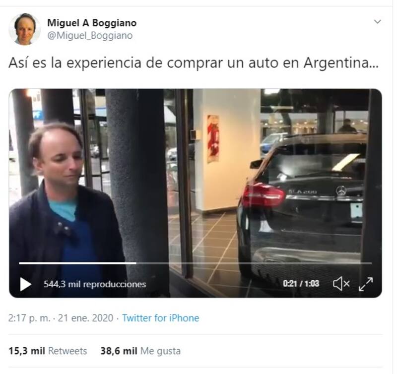 El economista Miguel Boggiano logró realizar un nuevo video viral, en este caso sobre la compra de autos en la Argentina y la cantidad de impuestos que incluye el precio. La publicación en Twitter ya alcanzó más de 15 mil retuits y arriba de 30 mil "me gusta".