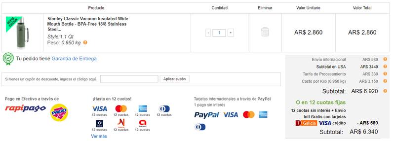 Cabe aclarar, sin embargo, que los precios de lista no corresponden al precio final que paga el usuario. Por ejemplo, en el caso de un termo Stanley, el precio final sería el siguiente. A este precio, además, hay que sumarle el costo de envío (en el caso del Correo, es de alrededor de $ 140 y en el caso de un courier privado, puede llegar hasta los $ 5.000).