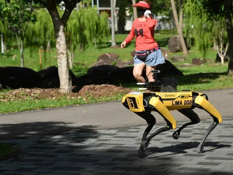 En Singapur, desarrollaron un robot de cuatro patas y parecido a un perro. El robot “Spotvigila a las personas en la vía pública para que cumplan los dos metros de distanciamiento social obligatorio. El Gobierno del país busca automatizar los controles. Estos robots fueron fomentados por el Grupo de Gobierno Digital y Nación Inteligente de Singapur junto con la Junta de Parques nacionales.