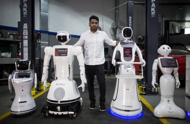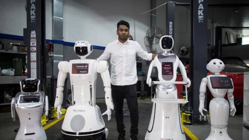 La compañía Reliable Robotics solía alquilar robots para eventos y fiestas. Cuando la pandemia llegó a Emiratos Árabes Unidos, donde tiene base la empresa, tuvieron que reconvertir sus modelos. El director de robótica e Inteligencia Artificial, Aswing Sarang, decidió reconvertir cuatro modelos de robots cambiándo su software: los transformaron para ponerlos a servicio del gobierno de Emiratos Árabes Unidos.
