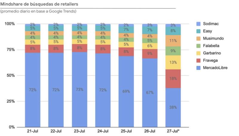 Google Argentina compartió las búsquedas con mayor crecimiento durante el Hot Sale. La plataforma analizó cuáles fueron los retailers favoritos de la gente durante el Hot Sale: MercadoLibre se posiciona como el preferido y nuclea entre el 72% y el 38% de las búsquedas diarias. Le sigue Fravega, Garbarino, Falabella, Musimundo, Easy y, por último, Sodimac.