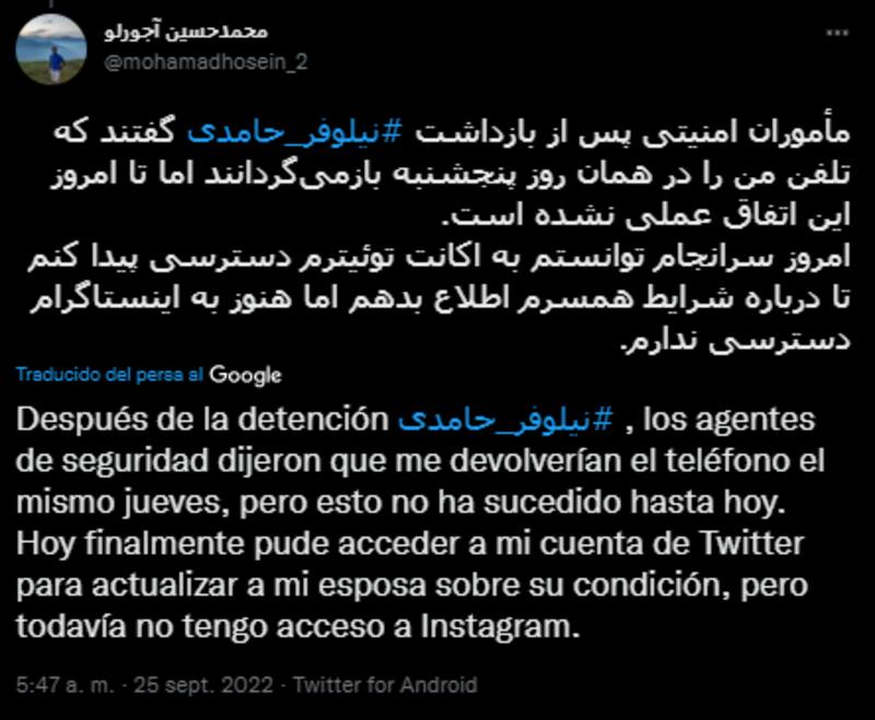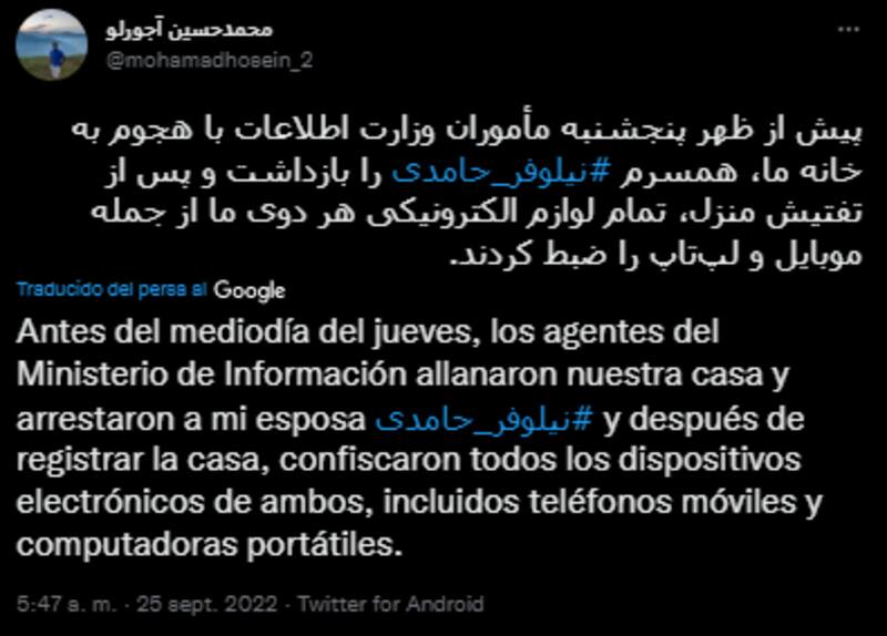 Niloofar Hamedi fue la primera periodista mujer en denunciar la muerte de Amini y se encuentra detenida. Mohammad Hossein Ajorlou, esposo de la trabajadora del Shargh Daily, aseguró que la comunicadora fue interrogada sin que supiera cuáles eran los cargos en su contra.