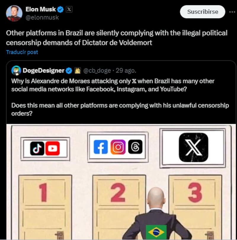Después de que Musk desafió esa decisión y dijo que reactivaría las cuentas de X que el juez había ordenado bloquear, Moraes abrió una investigación al multimillonario en abril. El juez es un blanco predilecto de Musk en X, al que apodó "Voldemort" por su parecido con el villano de la saga Harry Potter.