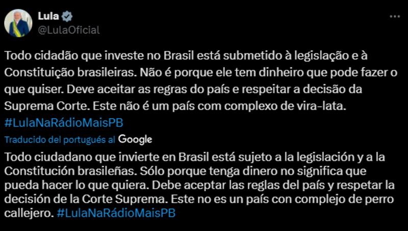 Solo unas horas antes, durante una entrevista con la radio MaisPB en Joao Pessoa, capital del estado de Paraíba, Lula enfatizó que cualquier empresario que opere en Brasil está obligado a cumplir con la Constitución y las leyes locales. "Cualquier ciudadano, de cualquier parte del mundo, que tenga una inversión en Brasil está sujeto a la Constitución brasileña y a las leyes brasileñas", declaró el mandatario.