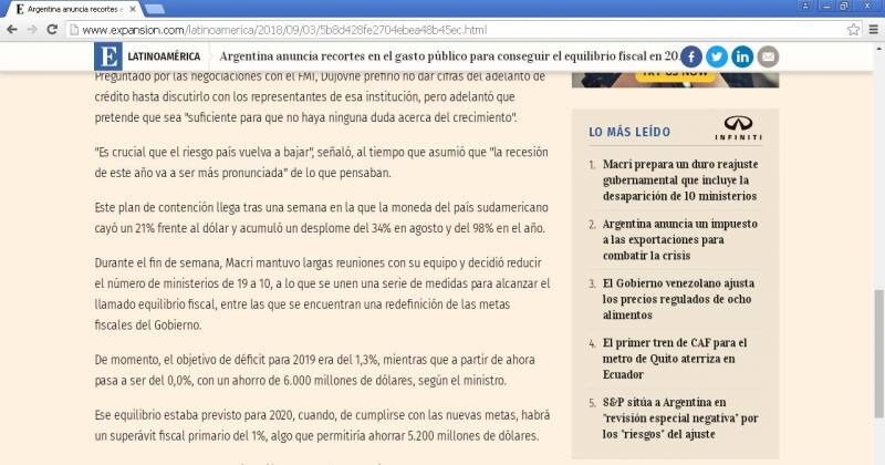 Dos notas de Argentina encabezaban hoy el ránking de las más leídas en el diario español Expansión: una del reajuste con la desaparición de 10 ministerios y una sobre el impuesto a las exportaciones.