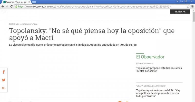El Observador también reseña comentarios de la vicepresidenta Lucía Topolansky el fin de semana, cuando catalogó de "brutal compromiso" el asumido por el gobierno argentino a comienzos de junio cuando acordó un préstamo por u$s 50.000 millones con el FMI para hacer frente a la crisis económica. "Yo no sé qué piensan hoy los partidos de la oposición frente al panorama que se ve. Vamos a esperar a escuchar algo", dijo Topolansky.