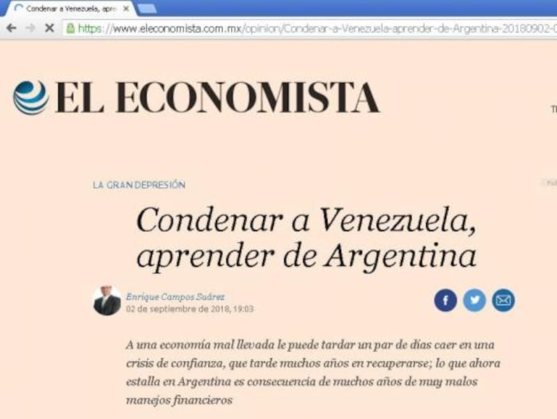 El periódico mexicano El Economista tituló que "el gobierno argentino se compromete a lograr equilibrio fiscal para 2019", mientras en una nota de opinión, hizo una suerte de paralelismo entre Venezuela y Argentina, aunque con una diferencia sustancial: dice que Venezuela se ha deteriorado tanto que dejó de ser un referente válido para advertir lo que puede suceder en un país que no cuide su estabilidad económico-financiera. Mientras que "con quien sí es posible aprender una lección de lo que no debe hacerse con la economía de un país es con Argentina".