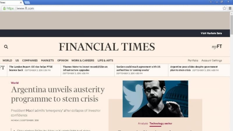 El diario británico Financial Times encabezó la portada vespertina con la nota "Argentina revela programa de austeridad para contener la crisis. El presidente Macri admite 'emergencia' tras el colapso de la confianza de los inversores".