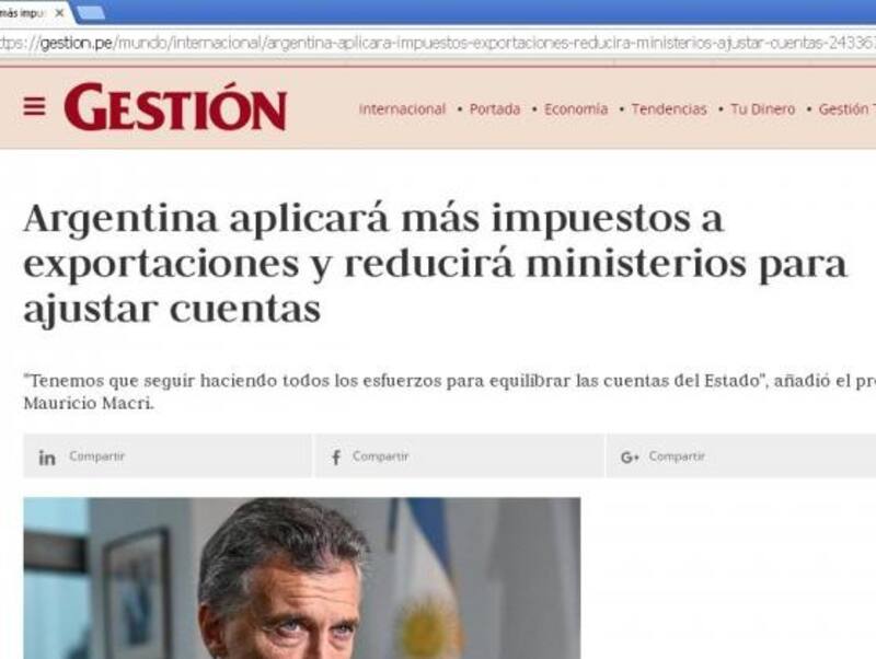 El periódico peruano Gestión dio cuenta de que "Argentina aplicará más impuestos a las importaciones y reducirá ministerios para ajustar cuentas".
