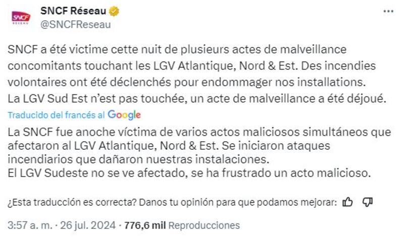 Francia sufrió este viernes un ataque organizado contra la red de trenes de alta velocidad en torno a París, que generó graves problemas en el tráfico y que tiene lugar a horas de la apertura oficial de los Juegos Olímpicos.