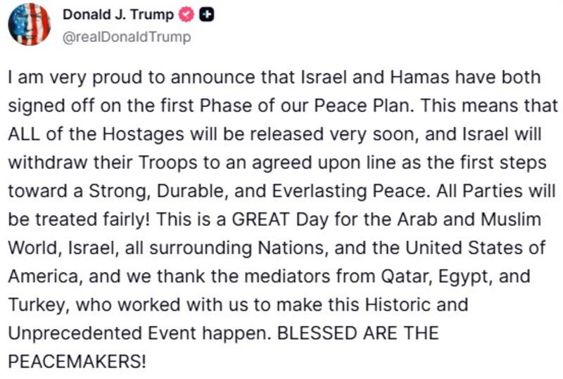 El presidente de Estados Unidos, Donald Trump, publicó este miércoles en Truth Social que tanto Israel como Hamás firmaron la primera etapa de su plan de paz.