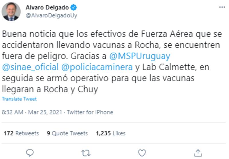 "Buena noticia que los efectivos de Fuerza Aérea que se accidentaron llevando vacunas a Rocha, se encuentren fuera de peligro. Gracias a @MSPUruguay @sinae_oficial @policiacaminera y Lab Calmette, en seguida se armó operativo para que las vacunas llegaran a Rocha y Chuy", escribió el secretario de la presidencia, Álvaro Delgado, esta mañana en su cuenta de Twitter.