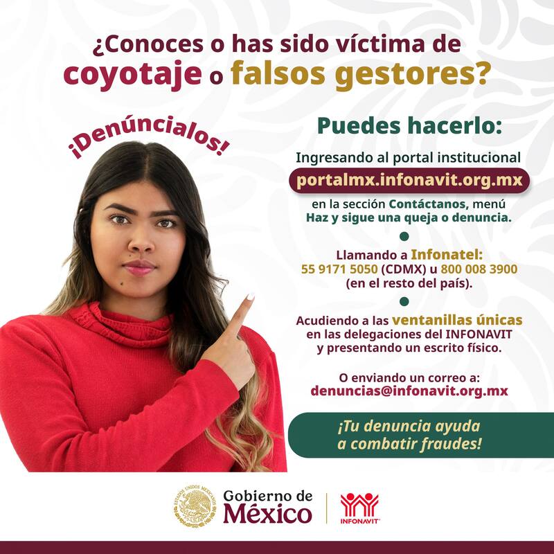 "Conoces o has sido víctima de coyotaje o falsos gestores? ¡Denuncialos!", indica Infonavit. Para hacer la denuncia debes seguir el siguiente protocolo y opciones.