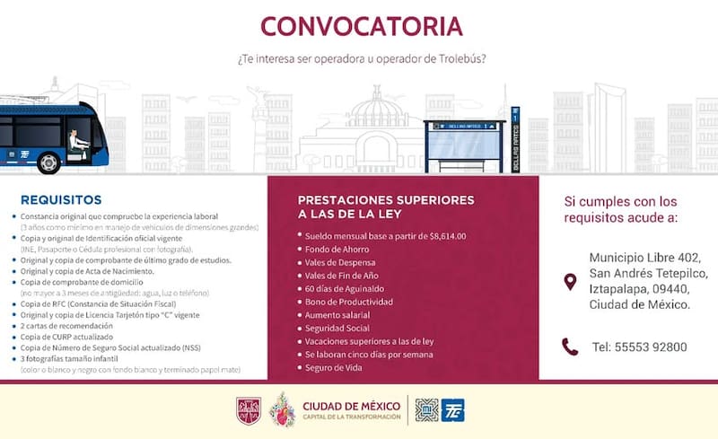 La Secretaría de Movilidad de la Ciudad de México, SEMOVI habilitó una convocatoria para todas las personas interesadas en ser operadores de Trolebús. La nueva oportunidad de trabajo por parte de la institución exige el principal requisito, que quien se postule, sepa conducir.