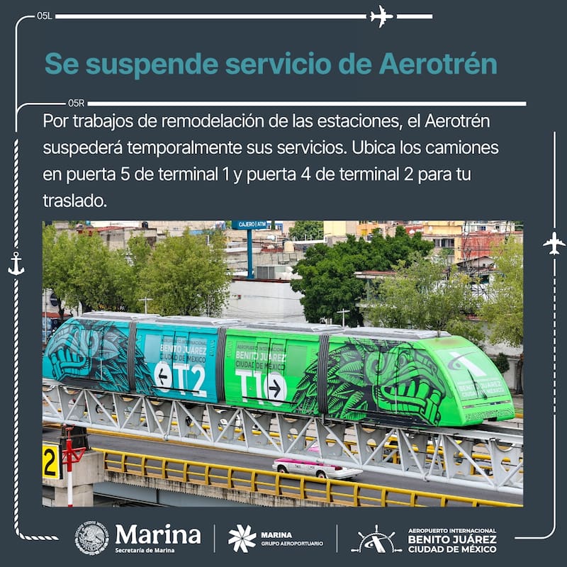 "A partir de mañana jueves 25 de septiembre, el Aerotrén suspenderá sus servicios, reanudando su operación el lunes 29 de septiembre, a partir de las 05:00 horas", reforzó el anuncio del Aeropuerto Internacional Benito Juárez CDMX.