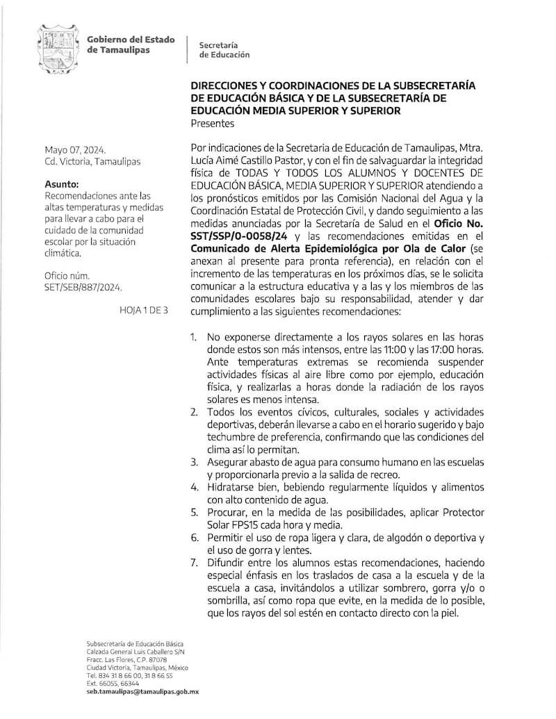 La Secretaría de Educación de Tamaulipas, por su parte, indicó que aquellas escuelas que no cuenten con infraestructura podrán dictar clases de forma virtual. Asimismo, compartió una serie de recomendaciones para cuidar a la comunidad escolar en la ola de calor.