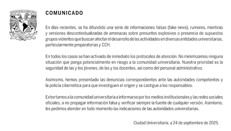 En un comunicado oficial, la Universidad Nacional Autónoma de México advirtió sobre la circulación de información falsa que busca desestabilizar a la comunidad. "En días recientes se ha difundido una serie de informaciones falsas (fake news), rumores, mentiras y versiones descontextualizadas", señaló la institución.
