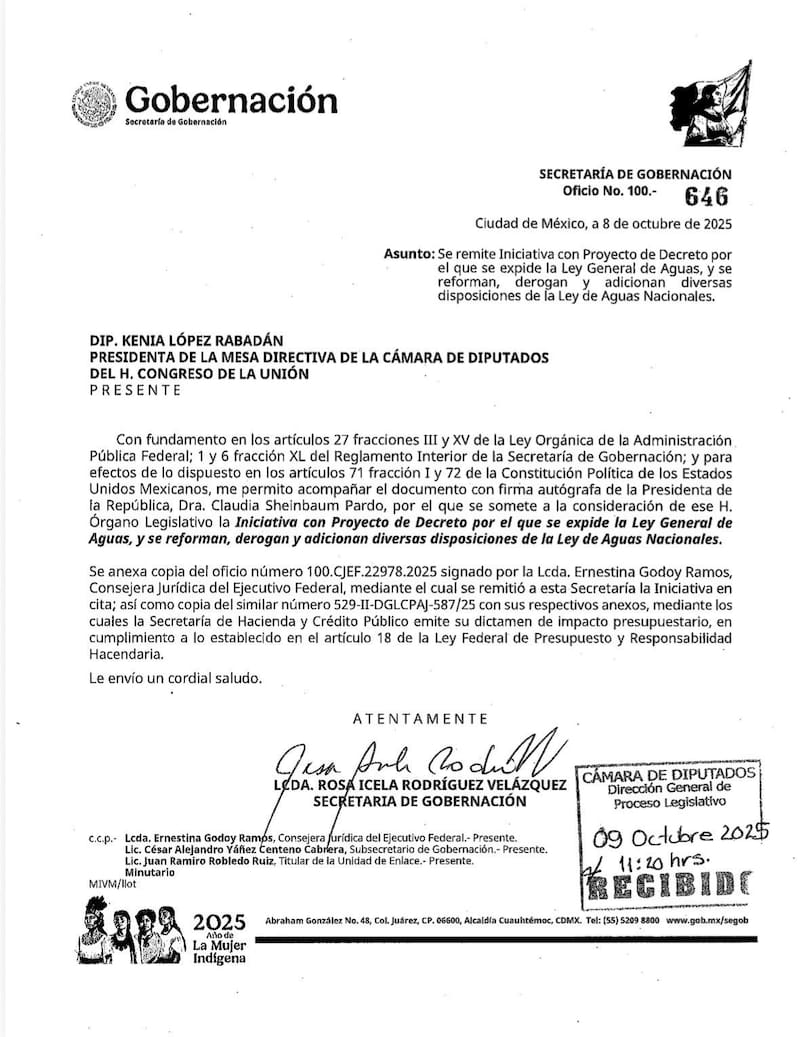De acuerdo con el oficio 100.-646 remitido por la Secretaría de Gobernación, la iniciativa expide la Ley General de Aguas y reforma la Ley de Aguas Nacionales, reglamentando los artículos 4° y 27 constitucionales para garantizar el derecho humano al agua y fortalecer la rectoría del Estado.