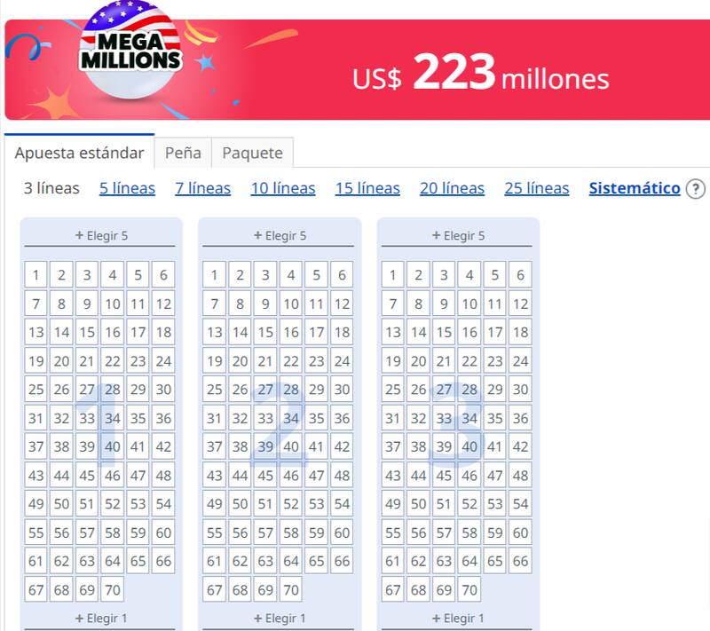 Para jugar Mega Millions hay que elegir 6 números: 5 de ellos deben ser entre el 1 y el 70 (sin repeticiones), y uno de ellos tiene que ser entre el 1 y el 25 (Mega Ball dorada). El sistema también ofrece una opción para los indecisos: escoge de manera automática y aleatoria las cifras.