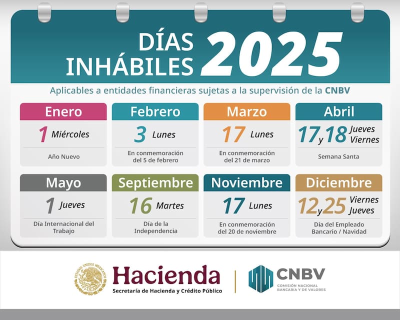 Según la CNBV y conforme al Calendario Bancario del 2025, los bancos no abrirán en las siguientes fechas: