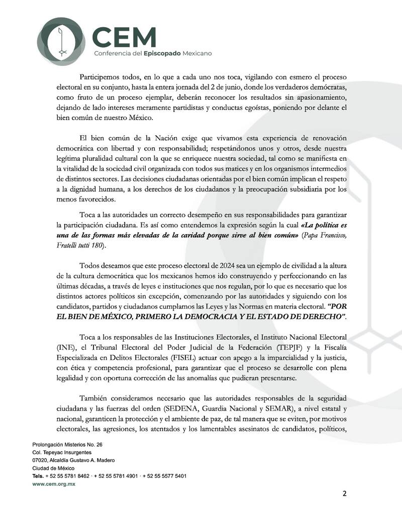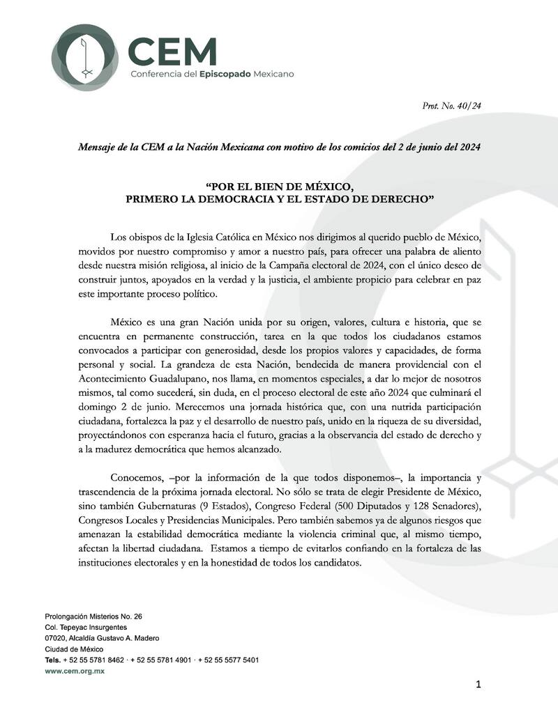 Los obispos de la Iglesia Católica en México nos dirigimos al querido pueblo de México, movidos por nuestro compromiso y amor a nuestro país, para ofrecer una palabra de aliento desde nuestra misión religiosa, al inicio de la Campaña electoral de 2024, con el único deseo de construir juntos, apoyados en la verdad y la justicia, el ambiente propicio para celebrar en paz este importante proceso político.